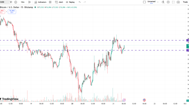 - Healthy Consolidation: In your 15m chart, price is oscillating between $75,847 and $76,325. This “flat” movement after a pump is a sign of bullish strength; it means buyers are absorbing every sell order without letting the price drop.
