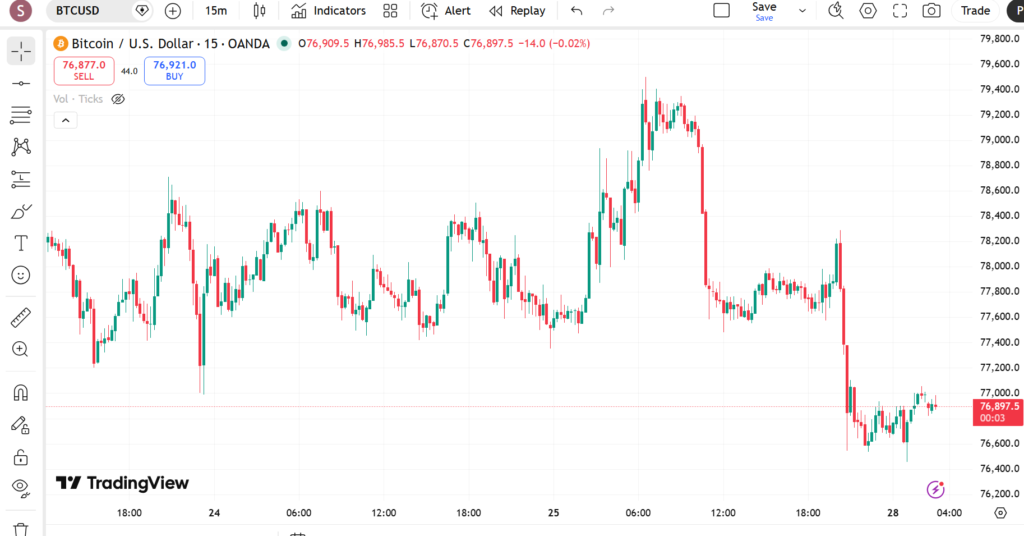 Now sitting around 76.8k – 77k, moving sideways after the dump. Feels like a pause, not a recovery.